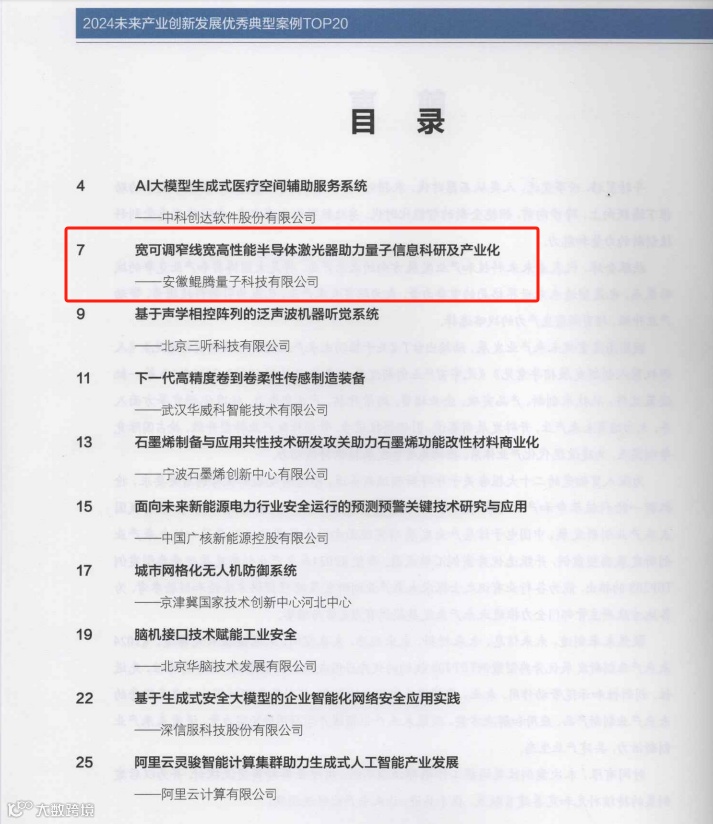 为深入贯彻党的二十大报告关于开辟新领域新赛道,塑造新动能新形势的有关要求,抢抓新一轮科技革命和产业变革的机遇,加快探索形成未来产业发展的高效模式,推动我国未来产业创新发展,中国电子信息产业发展研究院面向社会各界广泛征集了一批未来产业创新发展典型案例,并甄选优秀案例汇编成册。安徽鲲腾量子科技有限公司凭借案例《宽可调窄线宽高性能半导体激光器助力量子信息科研及产业化》成功入选TOP20并于4月26日举办的“2024中关村论坛平行论坛-未来产业创新发展论坛”上公开发布。