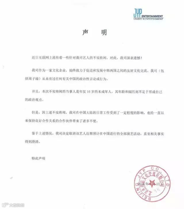 之后JYP公司发表声明,全篇看不到一个道歉字眼,甚至没有一个有效声明,还说我们取消艺人中国活动,明明是我们网民抵制的结果,却说成了自己主动。