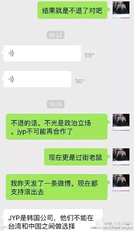 谁知不只周子瑜作死,其经济公司也智商堪忧,作死路上走到黑。以下是某经纪人发的对话截图。