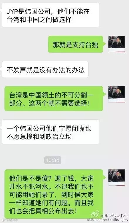 什么叫“JYP是韩国公司,他们不能在台湾和中国之间做选择”,中国主权是在联合国受到承认的,就算朴槿惠,甚至是他们历任的领导人拉出来也没有人敢说不能在中国和台湾做选择,一个韩国公司怎么敢?
