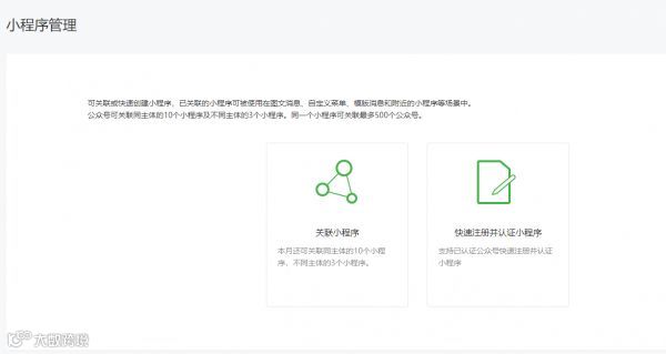 现在微信支撑公众号和小程序的互通相关。微信公众号能够快速相关和创立小程序,小程序也能够展示公众号的内容。已相关的小程序可被运用在图文音讯、自定义菜单、模版音讯和邻近的小程序等场景中。公众号可相关同主体的10个小程序及不同主体的3个小程序。同一个小程序可相关最多500个公众号。经过微信公众号后台的小程序管理功用,只需求简略操作便可完结相关和创立,并完结不同场景的展示。