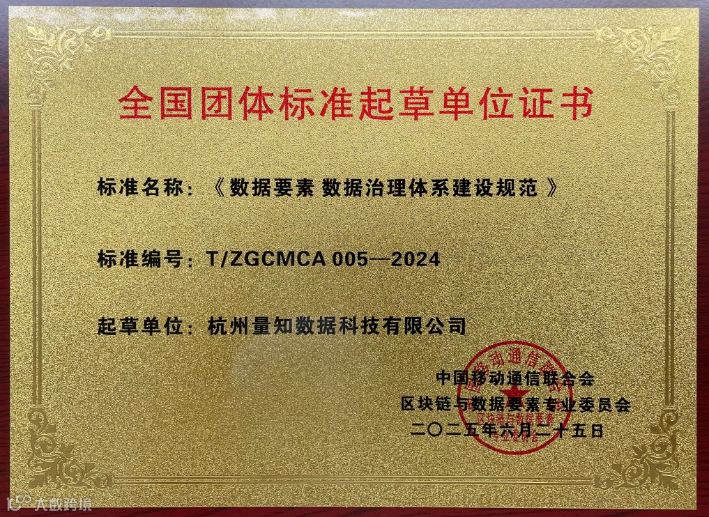 近日,中国移动通信联合会正式发布全国性团体标准《数据要素 数据治理体系建设规范》(标准编号:T/ZGCMCA005—2024)。杭州量知数据科技有限公司作为核心起草单位之一,凭借其在数据治理领域的技术积淀与项目实践,深度参与标准制定全过程,为数据要素市场的规范化发展贡献“杭州智慧”。