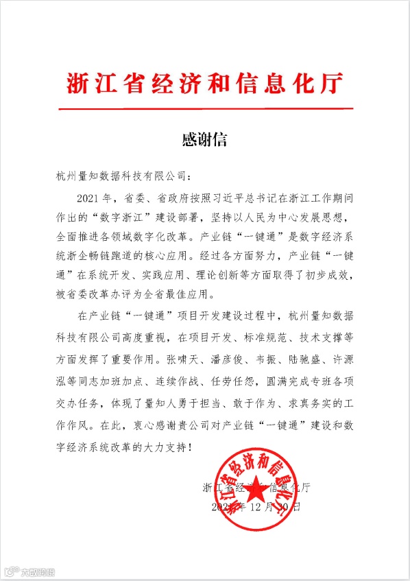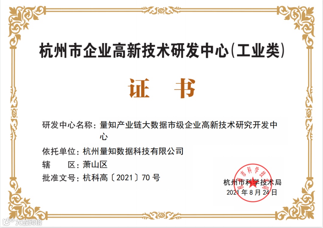 2021年8月24日,杭州市科学技术局发布《关于认定2021年杭州市企业高新技术研究中心的通知》,认定名单中,“量知产业链大数据市级企业高新技术研究开发中心”赫然在列。杭州市企业高新技术研发中心的认定,主要是从企业资质、研发团队、研发设施条件、研发投入、研发成果基础等五个方面来评估审核。量知能够获此殊荣,是量知科技全体员工努力的结果,也是量知科技研发实力的证明。