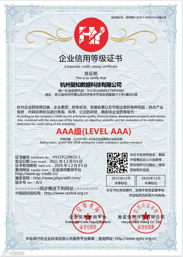 量知科技企业信用等级证书包含AAA级企业信用等级证书、AAA级资信等级证书、AAA级诚信经营示范单位等级证书、AAA级质量/服务诚信单位等级证书、AAA级重合同守信用企业等级证书、邵健诚信经理人、邵健诚信企业家、AAA诚信供应商、AAA级重服务守信用企业等级证书。
