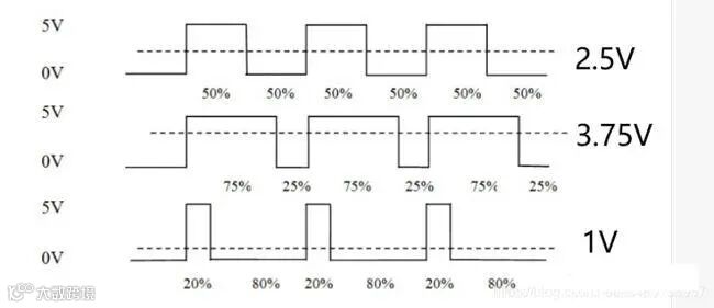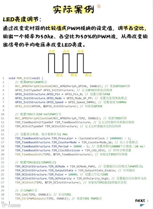 在PWM信号中,占空比决定了模拟输出的“大小”或“强度”。例如,在LED亮度控制中,较高的占空比会导致LED更亮,因为LED在更长的时间内被驱动为“开”状态。