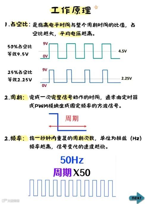 占空比是指PWM信号中“高”电平(或“开”状态)的时间与整个脉冲周期时间的比值。占空比通常用百分比表示,例如50%的占空比意味着“高”电平持续的时间是整个周期时间的一半。