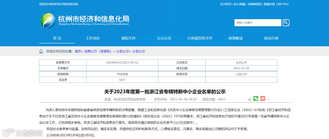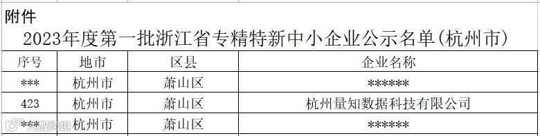 近日,浙江省经济和信息化厅、杭州市经济和信息化局公布"2023年度第一批浙江省专精特新中小企业"名单公示通过,量知科技获得“浙江省专精特新中小企业”认定。