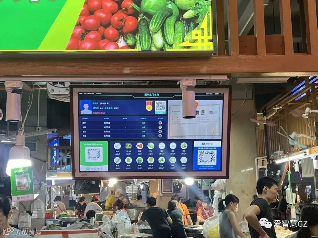 在市场最明显的地方,每个摊位上方都挂有一块智慧屏,上面显示着摊主姓名、证照信息、经营品类、价格,溯源码信息。让消费者关心的农产品质量如何、蔬菜农残是否超标、产品是否缺斤少两等问题都有了明确清晰的解答。