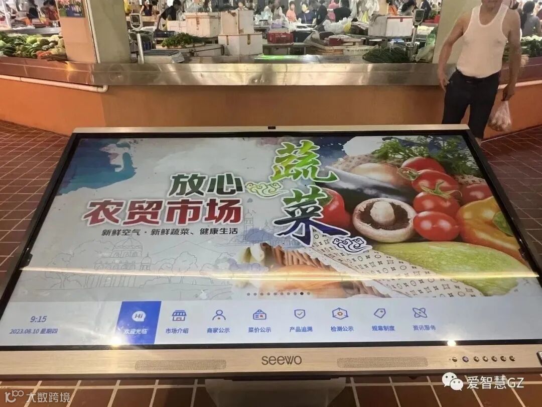 当进入市场开始,菜市场的智慧化就从细节里一点点流露出来。在市场的主出入口,一台智慧一体机的大屏上,轮番播放市场文化宣传报,实时滚动市场菜价、农药残留检测等信息,让消费者刚步入市场时,就能了解到市场信息。触碰一体机的可自由查询市场地图、商家公示、优惠信息、商户好评信息等功能,更是为消费者节省了时间。