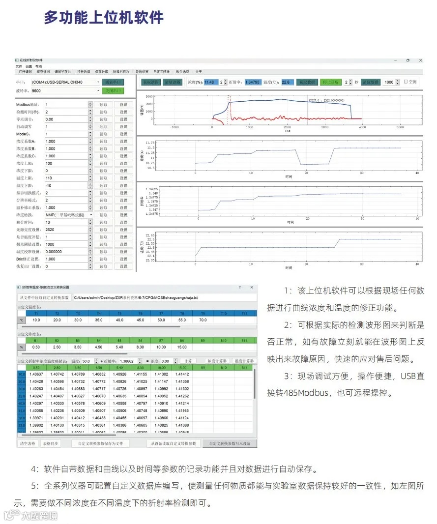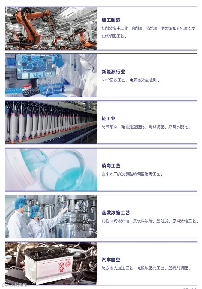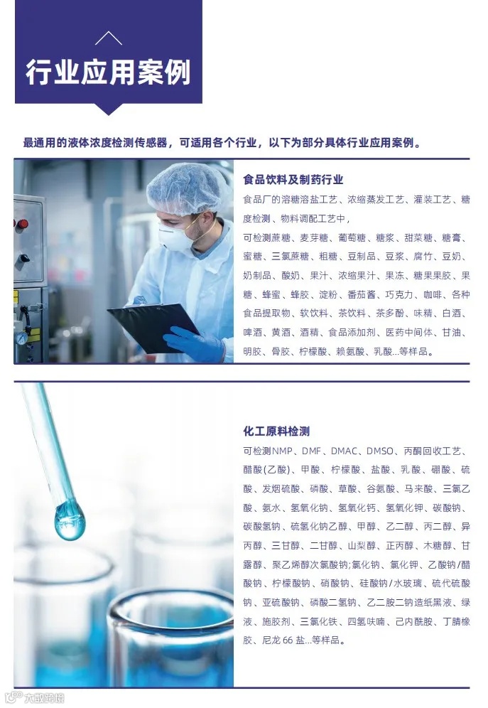 可连续实时监测样品浓度,减少离线检测数据的滞后性,仪器测量频率为1-10秒(可设置),检测数据可通过4-20mA或RS485信号输出,并与PLC、上位机进行联动控制,可配置自动清洗装置免除维护烦恼。该产品为我公司自主研发生产的新型浓度传感器,具有体积小巧、安装维护方便、高效稳定,综合性价比高等优势。可帮助客户大幅度提升工作效率,提高产品合格率,降低生产成本。