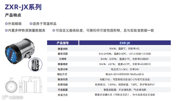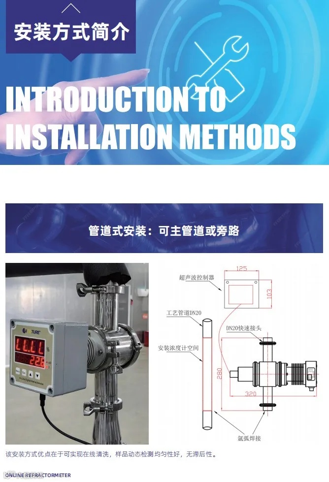 在线折光仪,又名在线浓度传感器,是利用折射原理研发制造的光学传感器,通过光的折射角度变化反映溶液浓度或密度的变化,主要用于在生产过程中对浓度发生变化的液体实施在线测量,安装方式可分为管道式和罐体式,通常显示为Brix%(可溶性固形物TDS含量),或者质量百分比%以及折射率和温度。