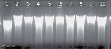 提取多种样本的500mg土壤样品总DNA,经1.2%琼脂糖凝胶电泳(0.5×TAE)结果如下: