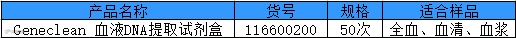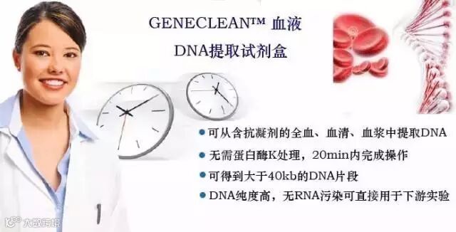 MP Biomedicals的Geneclean DNA 血液提取试剂盒可从全血、血清、血浆、细胞质样品中提取基因组DNA、线粒体DNA。可纯化含抗凝如EDTA、肝素的样品。不需要蛋白酶k的处理,20min内即可完成操作。可纯化40kb以上的DNA,得到的DNA纯度高,无RNA污染,可直接用于下游实验。