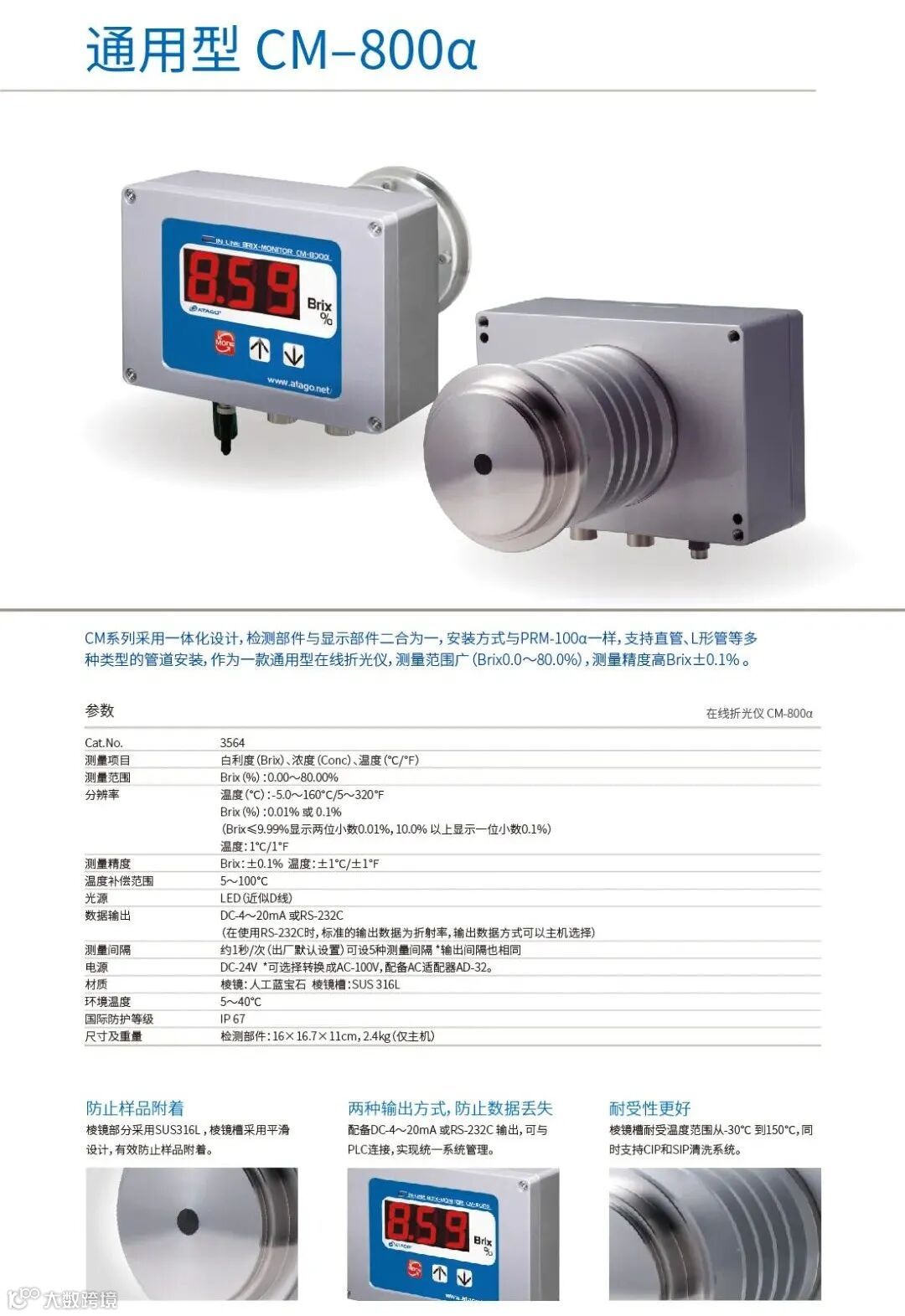 ATAGO(爱拓)在线折光仪 CM-800α,已广泛应用于食品、生化、制药、制糖、饮料、化工等行业,为原液、提取、混和、清洗等实现多流程浓度监测,有效保证产品的品质统一性,并全面提高企业自动化生产水平!