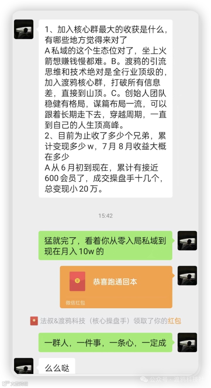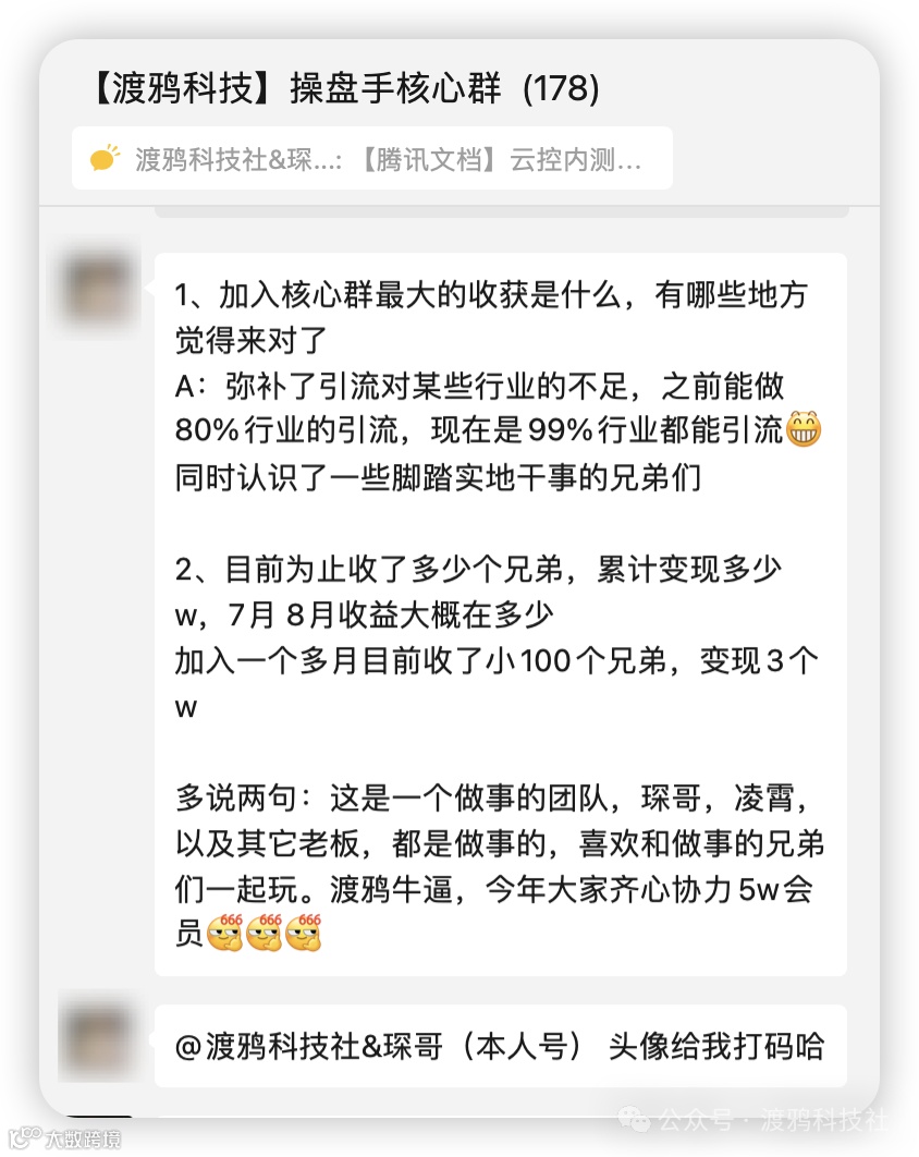 琛哥当时花了非常大精力跑通前端流量,让后端稳定,在半年时间里把渡鸦做到第7群,3000+人的规模,当时已经实现月入10w+了