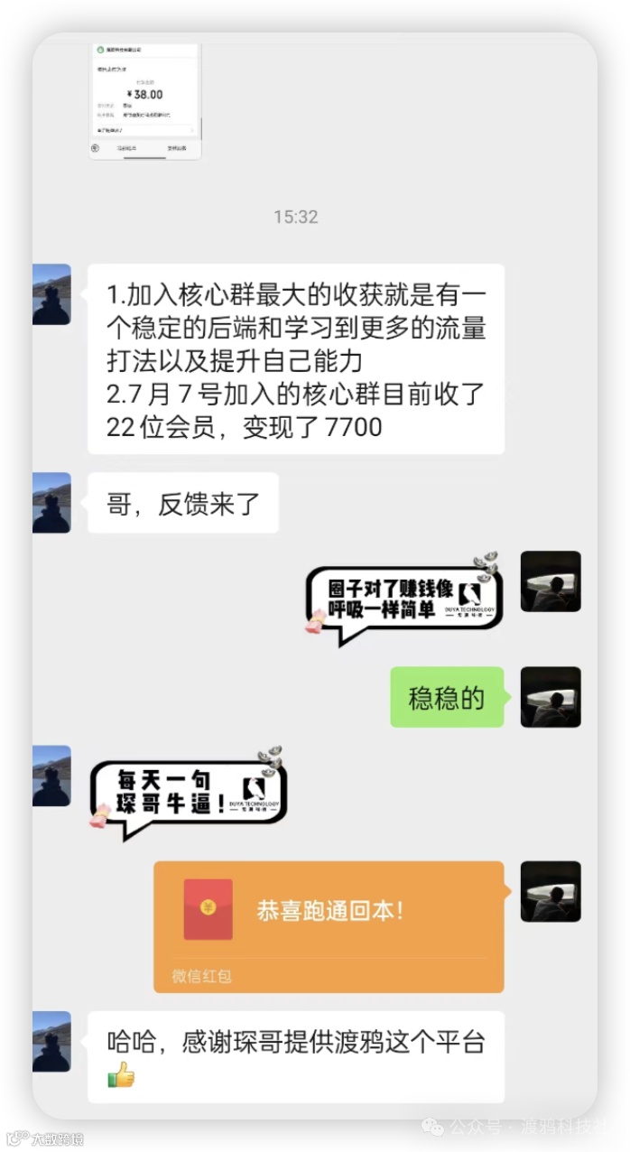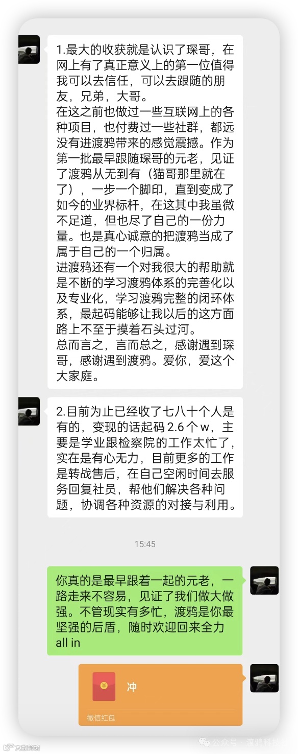 渡鸦科技社的388门槛费,你拿走90%分红(10%作为社群运营成本),相当于一单收益 350,开 3 单,你就日入斗金了。