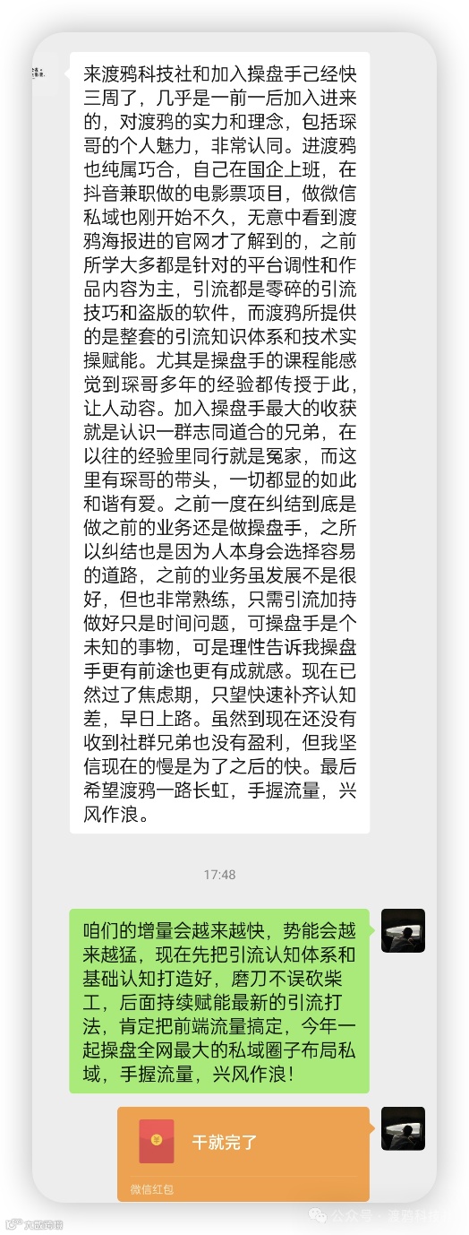 我们希望你熟练掌握多种创业粉的获客玩法,为渡鸦科技社的拉新做出贡献,成为渡鸦的【流量核心操盘手】