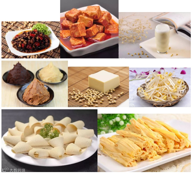 非发酵的豆制品(如毛豆、青豆、干豆等)、豆芽、豆浆、水豆腐、干豆腐(如豆腐干、豆腐衣等)、油豆腐、冻豆腐等。