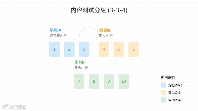 334代表一种测试资源(如账号)的分配比例示例。例如,若有10个测试账号,计划测试3种不同的内容模板类型(A、B、C),可按3:3:4的比例分组。