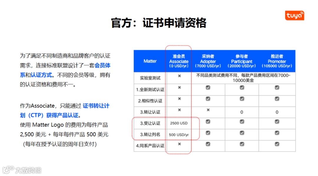首先,涂鸦不仅能够为开发者降低Matter设备认证成本,还能助力开发者实现自主可控的认证。联盟官方认证流程上显示,认证一款Matter产品需先缴纳至少7000美金年费成为联盟会员。除会员费之外,一款产品的实验室测试费从7000到10000美金不等,证书申请费用为2000到3000美金不等。