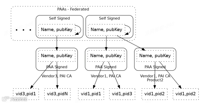 据了解,联盟通过“PAA——产品中间证书(即PAI,Product Attestation Intermediate)——DAC证书”这一签发链路,对Matter设备进行认证,以保障每个设备的DAC证书都是独一无二的。而PAA包括VID-Scoped PAA和Non-VID-Scoped PAA。设备厂商、品牌厂商等开发者可以选择申请成为PAA并通过VID-Scoped PAA为自己颁发证书,也可以直接选择与Non-VID-Scoped PAA机构合作,来完成设备认证。