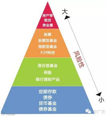 “理财金字塔”的原理是:最底层较宽较稳健,它是建立理财规划的基石,包括风险较小的理财产品,如储蓄、保险、国债等等;中层是年期、风险、回报都在中等水平,如企业债券、金融债券、优先股、各类基金等等;顶部较窄,投入资金不多,承担风险多,收益相对较高的具有进取性的投资产品,如房产、股票、期货等等。