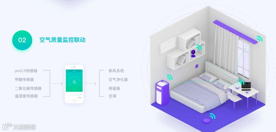 当监测到甲醛、二氧化碳等有害气体或是空气温湿度起伏,可通过场景联动设置自动开启空净、新风系统等装置,及时调节环境,保持清新。
