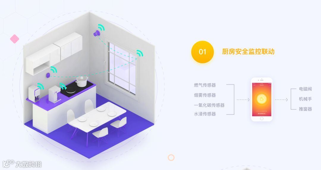 利用燃气+烟雾+水浸+一氧化碳组合的厨房安全监控场景,当感应到危险信号时,自动关闭阀门,开窗通风报警。