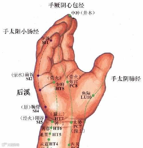 后溪穴属小肠经,但它同时也是奇经八脉的交会穴,直通督脉,泻心火、壮阳气、调颈椎、利眼目、正脊柱。临床上,颈椎出问题,腰椎出问题,眼睛出问题,都可以用这个穴,且效果非常明显。也就是说,它可以调整长期伏案或在电脑前学习工作给身体带来的不利影响。