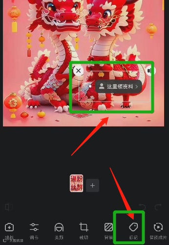 在发布笔记时,右划可以看到标记两个字,相当于直接在图里@,这时候被@的号可以带钩子,比如(这里领资料)可以用炮灰小号。