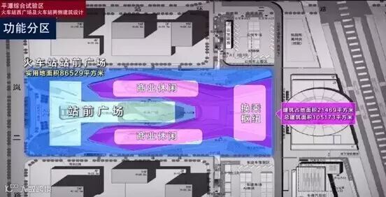 火车站站前广场位于地块中部,实用地面积86529平方米,建筑占地面积21469平方米,总建筑面积105173平方米。由换乘枢纽、休闲商业及站前广场组成。