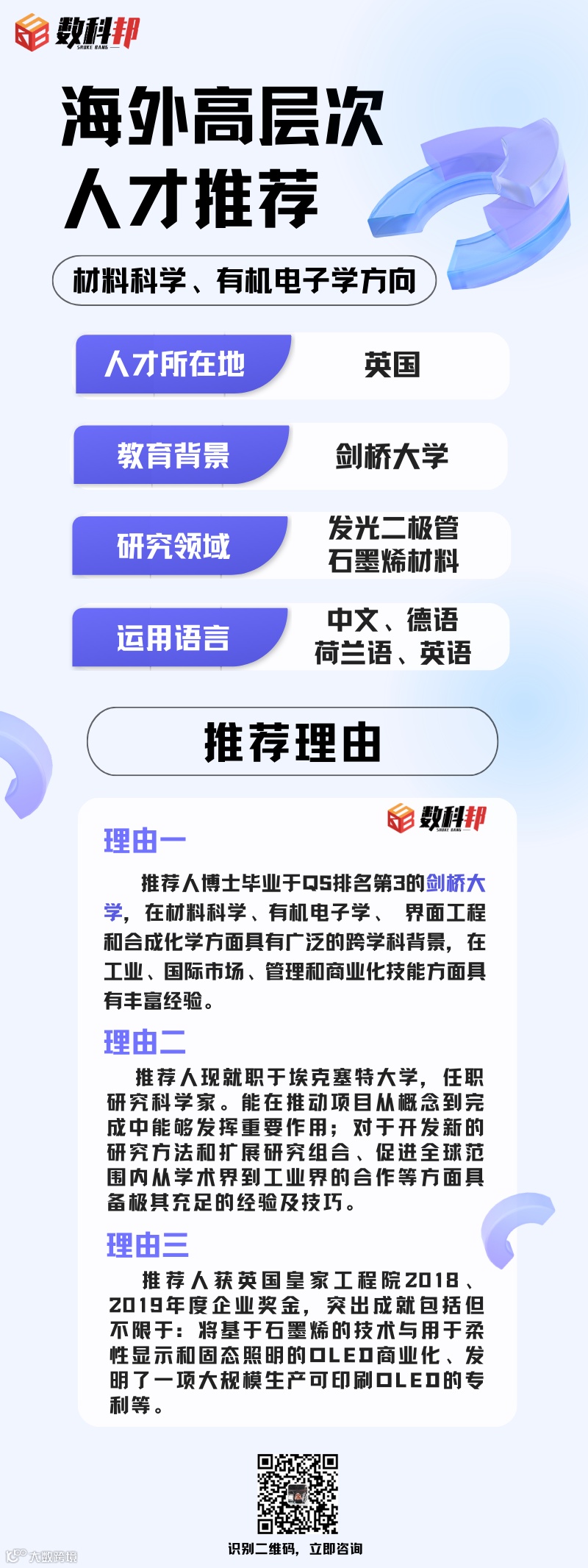 人才推荐 | 剑桥大学(QS排名第3)博士,材料科学、有机电子学方向