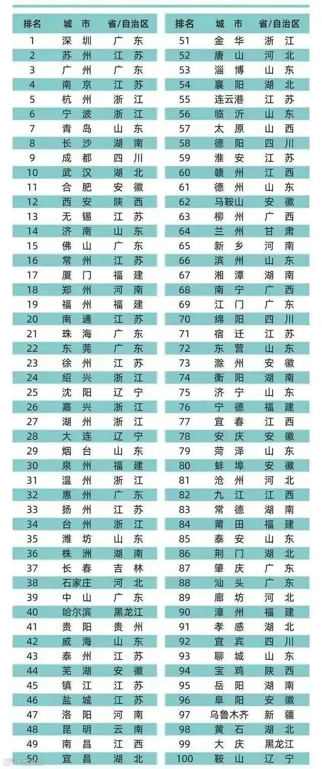 整体来看,中国制造业发达的100个城市共划分为跃升期、扩张期、发展期、起步期四类城市,城市数量分别为3个、26个、29个和42个。