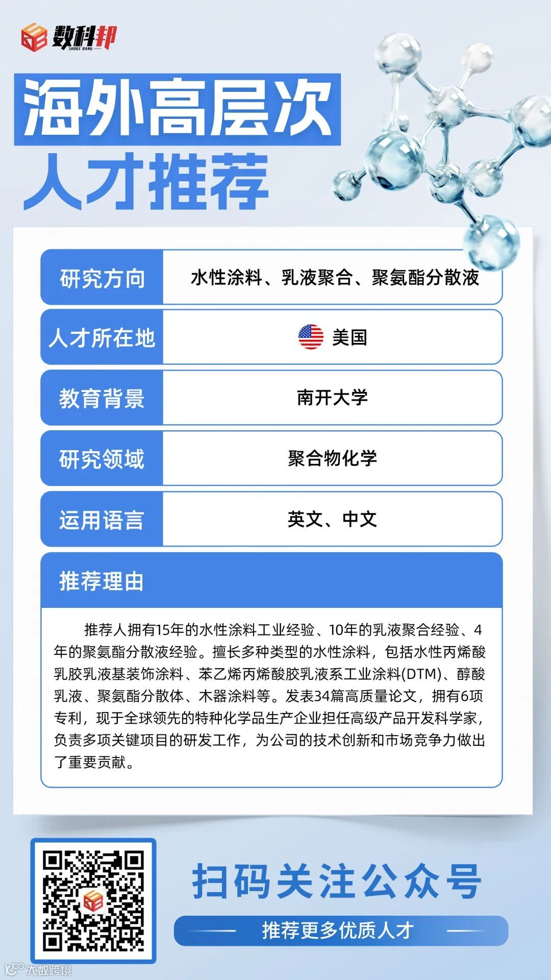 人才推荐 | 聚合物化学领域人才,擅长水性涂料、乳液聚合方向