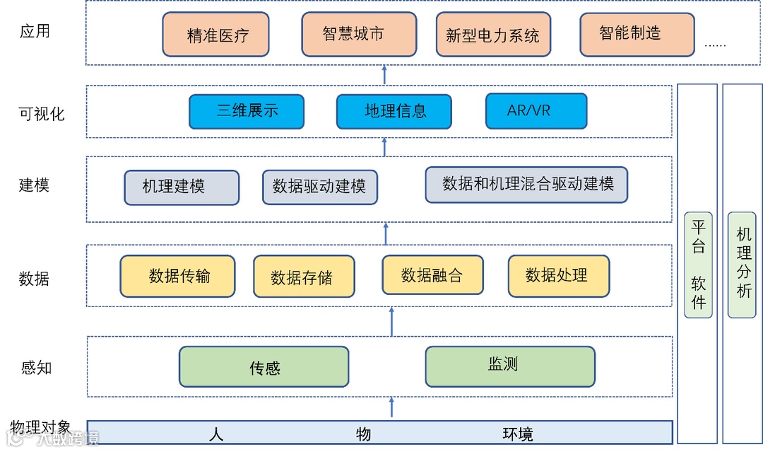 图1是数字孪生的技术架构,包含五层,自下而上为感知、数据、建模、可视化和应用。另外,还需要平台软件,机理分析的支撑。建立数字孪生,数据是基础,模型是核心,软件或平台是载体。