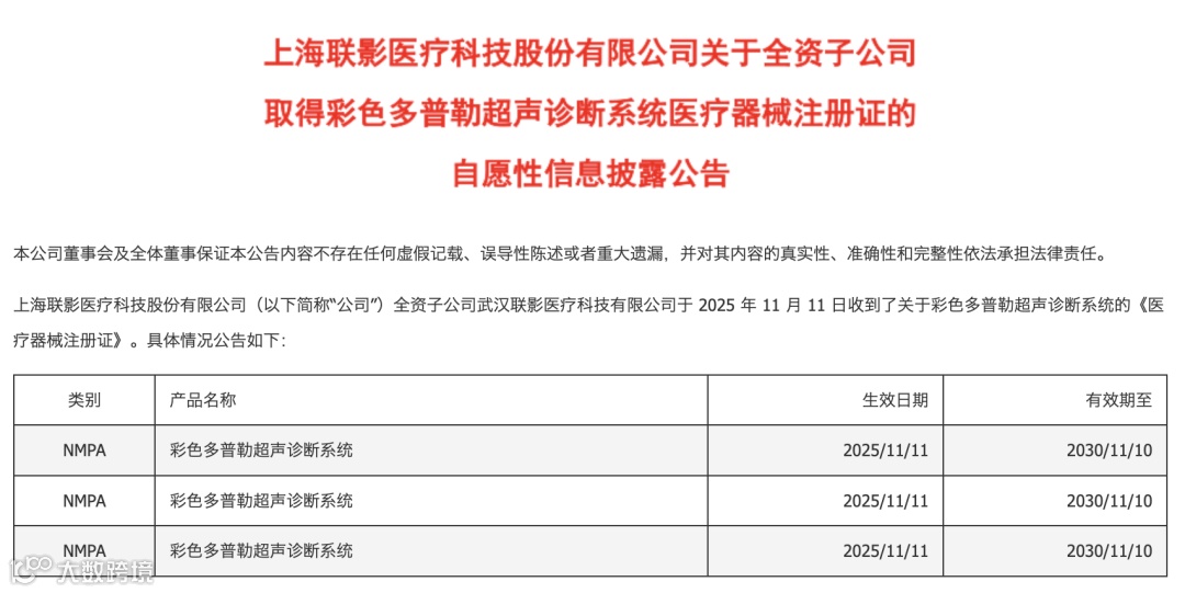 公司全资子公司武汉联影医疗科技有限公司当天获得三项由国家药监局(NMPA)颁发的《医疗器械注册证》,产品为自主研发的“彩色多普勒超声诊断系统”。紧接着的11月12日,联影医疗在杭州举办了全球超声产品发布会,正式推出历时六年研发的uSONIQUE系列。