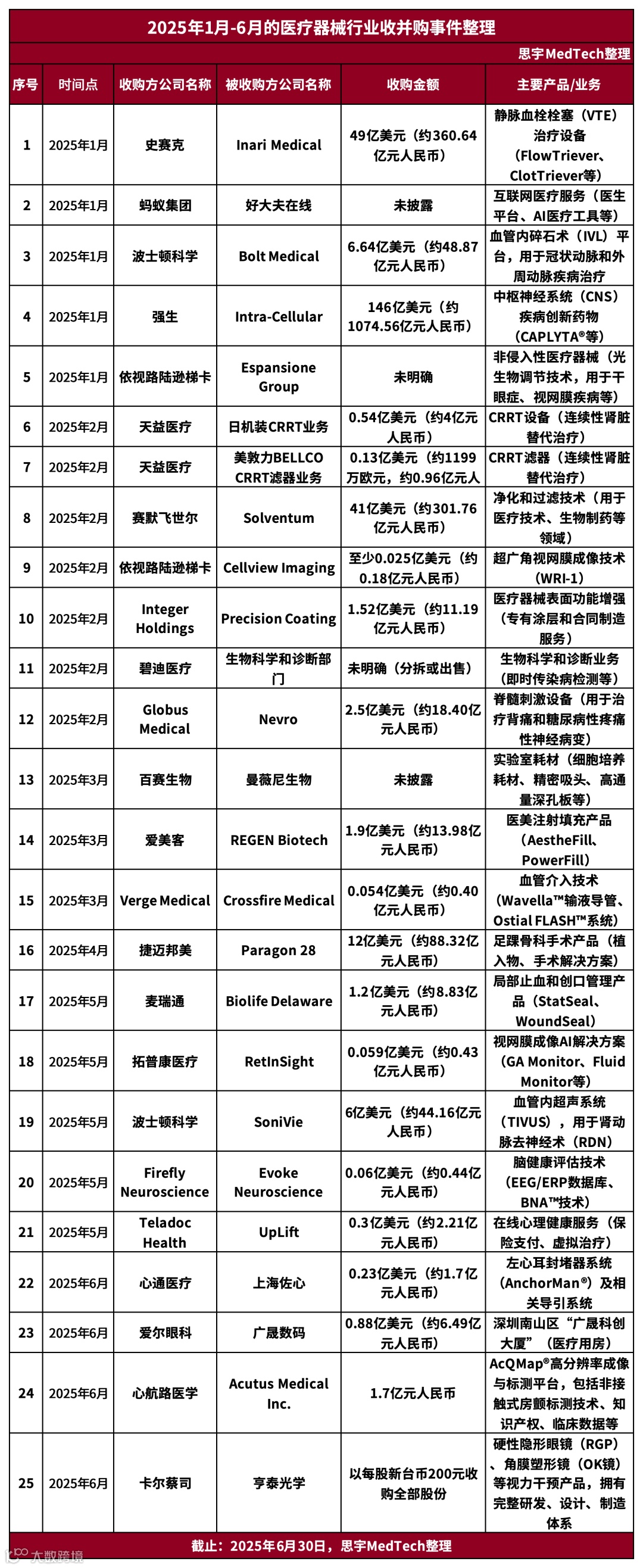 2025年上半年,医疗器械行业共披露至少25起并购事件,涵盖外资巨头主导的大型交易与本土企业对核心资产的精准收购,交易金额从数千万人民币到百亿美元级不等。并购方向涵盖介入设备、神经调控、医美、眼科、成像平台及数字医疗,整体反映出产业整合、产品线协同与技术平台补位的并行趋势。