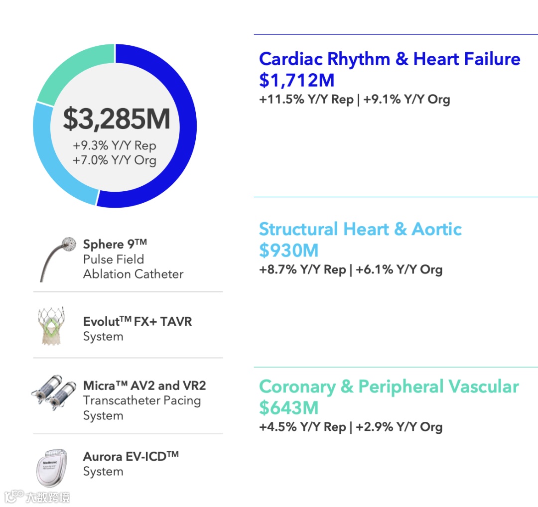 结构性心脏病与主动脉板块(9.30亿美元,+6.1%有机)维持中速增长,TAVR产品Evolut FX+扩展Redo-TAVI适应症,Avalus Ultra手术瓣膜与Penditure左心耳封堵系统协同增强术式完整性。