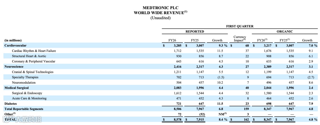 2025年8月19日,美敦力(Medtronic, NYSE: MDT)发布了2026财年第一季度业绩。公司实现营收85.4亿美元(约合人民币613亿),同比增长6.7%,有机增长4.8%,连续第11个季度维持中个位数增长区间,并预计在产品上市高峰带动下,下半年增速将进一步加快。