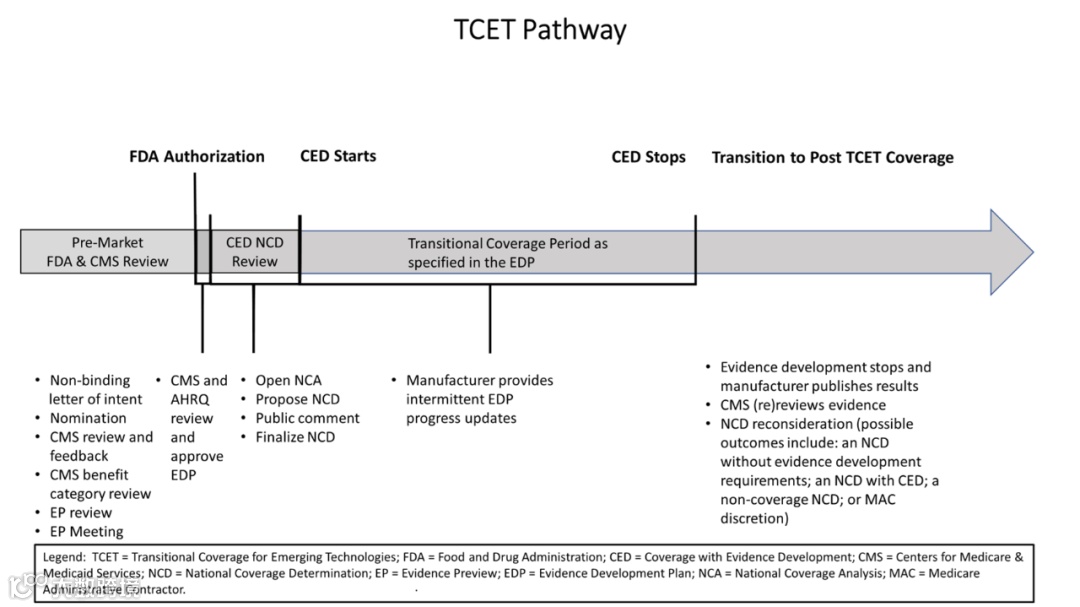 CMS其实并非完全没有动作。近年来,它推出了 TCET(Transitional Coverage for Emerging Technologies) 等项目,试图为新兴技术提供过渡性支付。TCET的核心思路是:先让创新产品在有限范围内获得临时支付,同时逐步收集临床证据,为后续永久覆盖打基础。