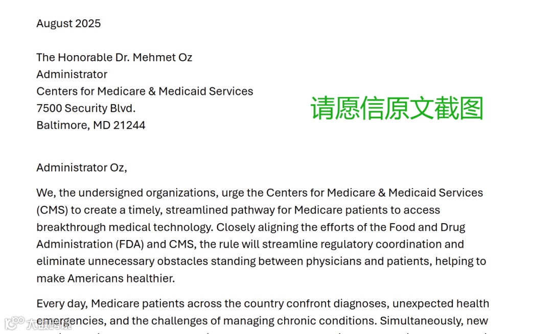 67家医疗健康与技术相关组织,联合向美国医疗保险与医疗补助服务中心(CMS)署名请愿,要求加快创新医疗器械的医保覆盖速度。他们呼吁CMS与美国食品药品监督管理局(FDA)更紧密地协同,因为当前的流程往往导致:新产品即便通过FDA的审批,也要等待多年,才可能进入医保支付体系。