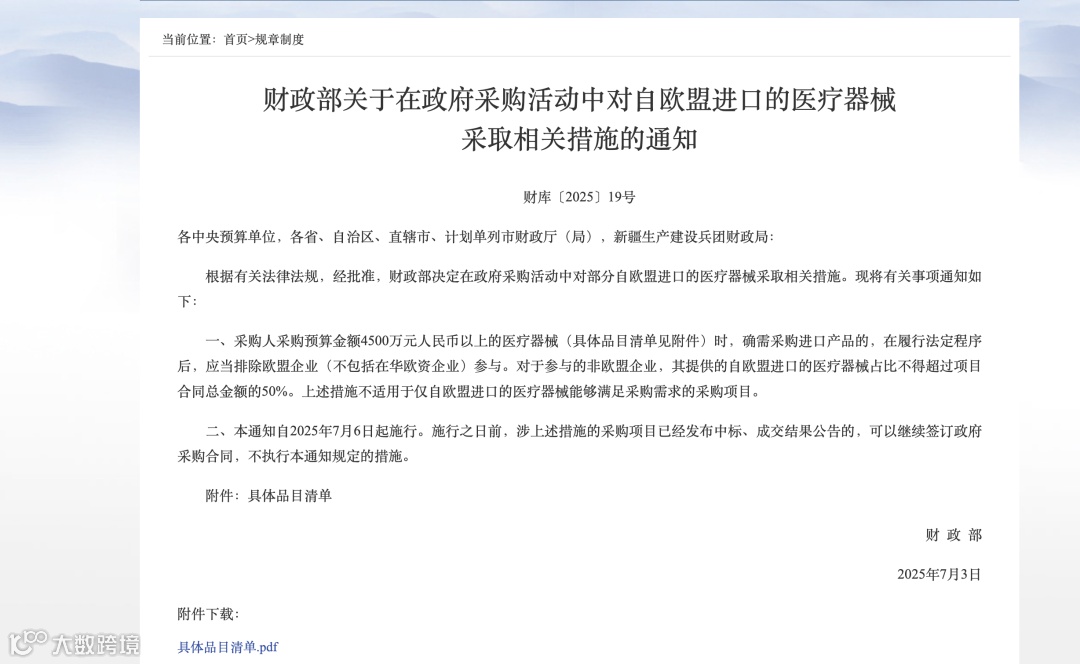 2025 年 7 月 3 日,财政部发布《财政部关于在政府采购活动中对自欧盟进口的医疗器械采取相关措施的通知》(财库〔2025〕19 号)。该通知自 2025 年 7 月 6 日起正式施行。