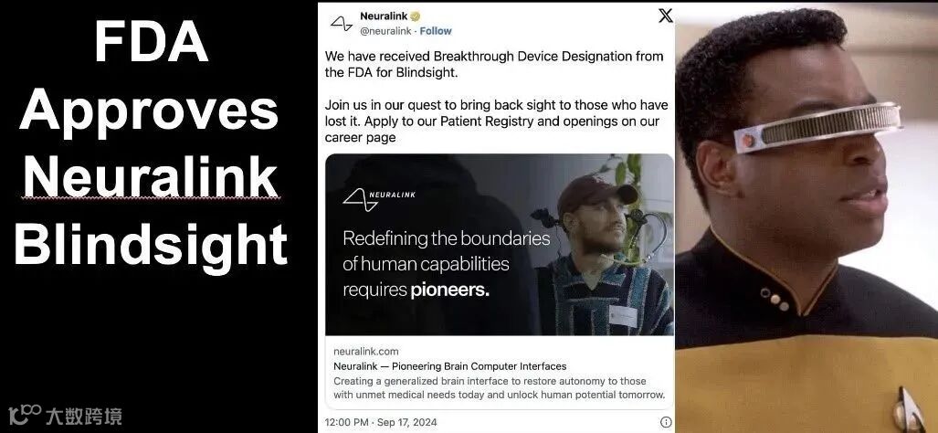 2024年10月,Neuralink的Blindsight系统获得FDA“突破性医疗器械”认定。其通过电极直接刺激视觉皮层,帮助视觉路径受损患者重建光感。