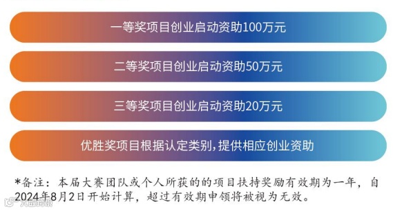 项目获奖后,需在一年内(自2024年8月2日开始计算)按要求在杭州高新区注册公司并开展落地运营,依照《关于进一步提升杭州高新开发区(滨江)高层次人才及团队创新创业“5050计划"的实施意见》(杭高新[2023)1号)申请项目落地发展支持。获奖项目未在规定时间内落地,视为放弃项目落地发展支持。