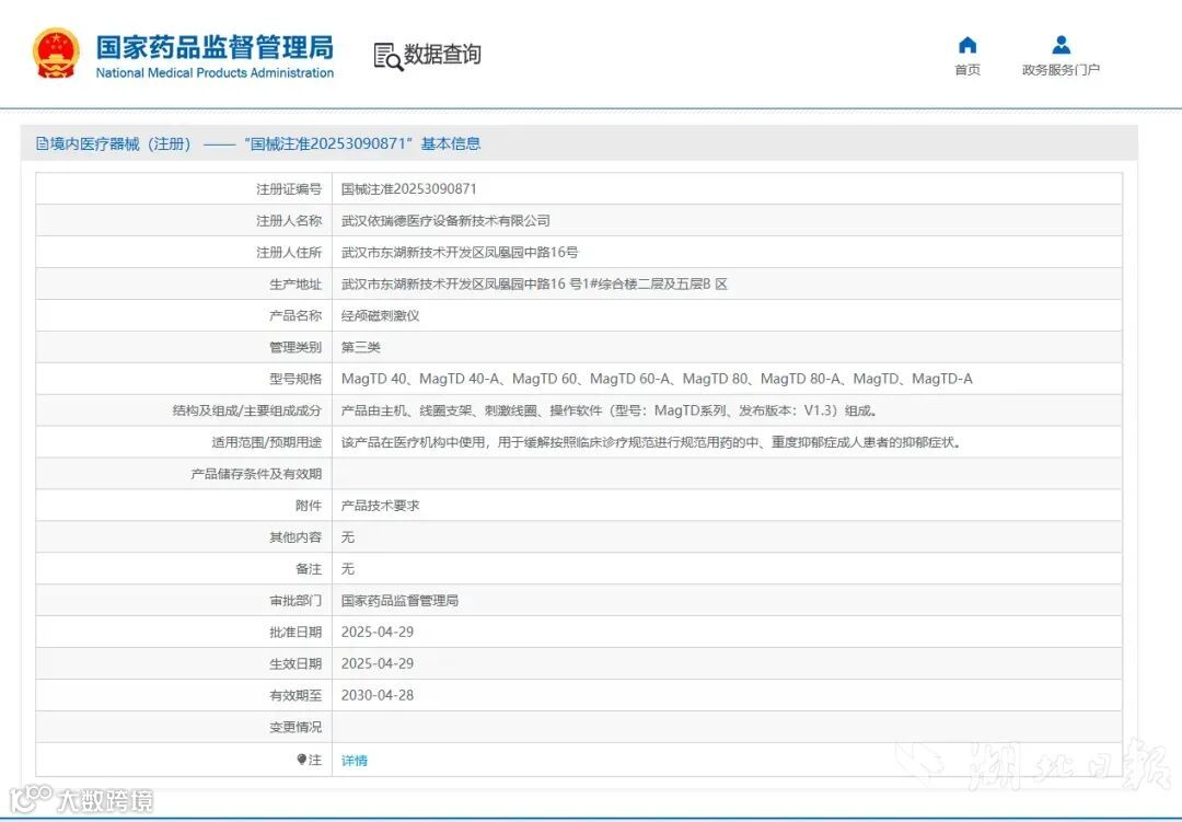 近日,武汉依瑞德医疗设备新技术有限公司(简称武汉依瑞德)自主研发生产的经颅磁刺激仪(国械注准20253090871),获得了国家药品监督管理局核发的医疗器械三类产品注册证。这标志着该公司的经颅磁刺激仪可用于抑郁症的治疗,且这是国内首张精神领域经颅磁刺激仪的三类医疗器械注册证。