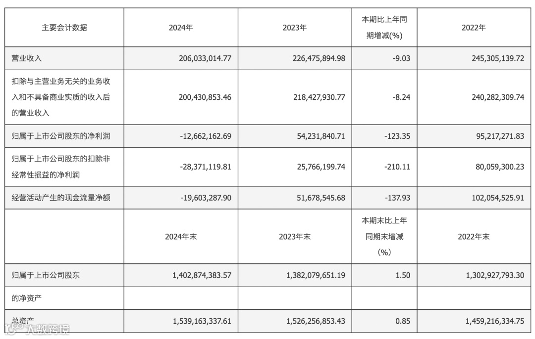 2024年公司营业总收入为2.06亿元,同比下降9.03%。归母净利润亏损1266.22万元,同比下降123.35%。扣非归母净利润则为亏损2837.11万元,同比下降210.11%。