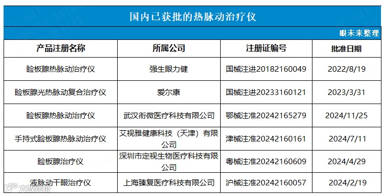 现已有多家医疗器械厂商在开发热脉动技术路径的干眼治疗仪器,此前国内已获批上市的热脉动治疗仪(进口2款+国产3款)一共有 5 款,包括强生眼力健的 Lipiflow 睑板腺热脉动治疗仪、爱尔康的 SYSTANE iLux 睑板腺光热脉动复合治疗仪、臻复医疗的Tearmaestro 液脉动干眼治疗仪、定视生物的 DisionEyemore 睑板腺治疗仪、艾视雅的手持式睑板腺热脉动治疗仪。