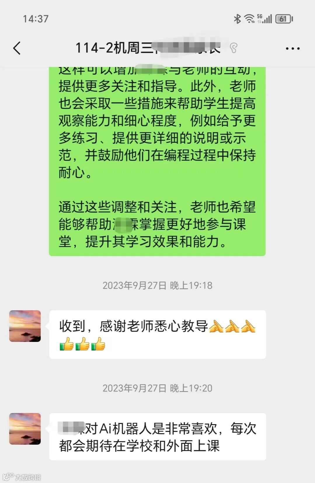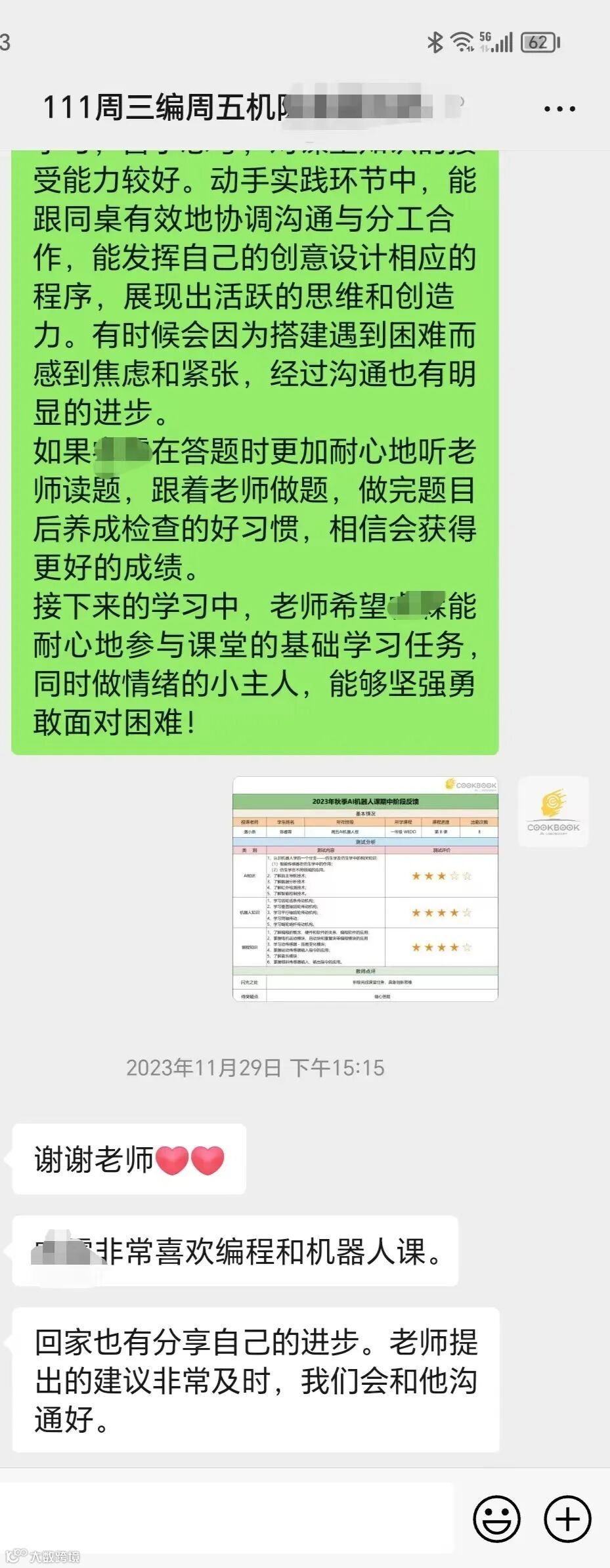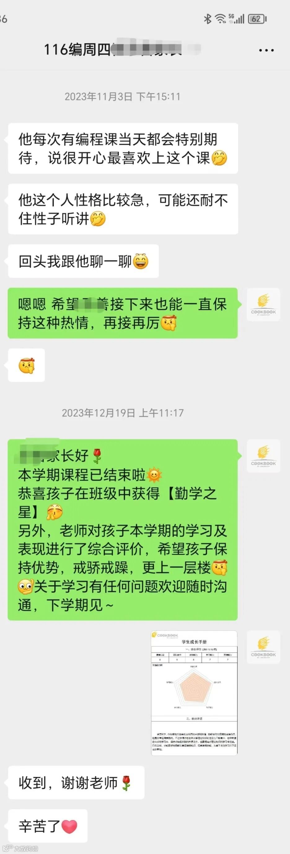 教育从来都是双向奔赴,为了让家长更好了解我们的课堂,见证孩子的点滴成长。我们在每次课后,都会及时和家长沟通反馈本节课的课堂内容、学习目标和重难点,孩子的课堂表现学习和成长,保证及时回复家长的疑问。在反馈的同时,我们也不断总结和反思,研精致思,力求完美,一切的努力都是为了孩子更好的提升。