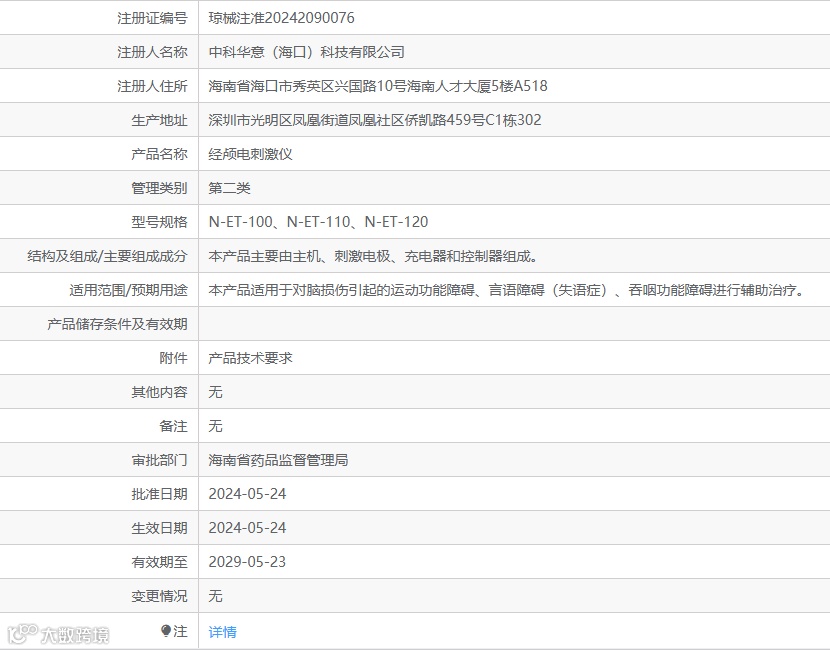 经颅电刺激仪已获批医疗器械注册证。该产品基于临床专家共识与指南,采用无创神经电刺激技术,通过置于头皮表面的电极将低强度电流作用于大脑皮层,通过改变皮层兴奋性、增加突触可塑性、影响神经网络功能连接等方式,针对前额叶脑区实施个体化精准无创电刺激,搭配智能化参数配置,为临床提供丰富的个体化调控方案。