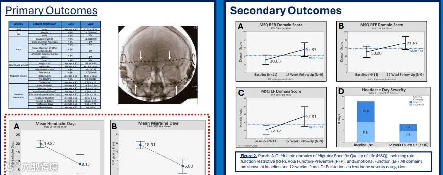 经过12周的治疗,参与者报告说,每月偏头痛的天数显著减少,从研究开始时的平均19天减少到约7天,生活质量也有所改善。